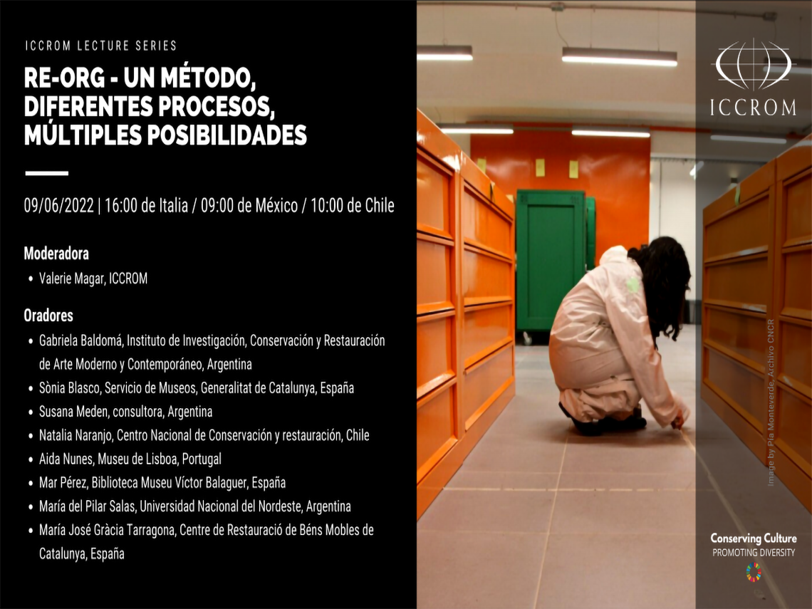 Este nuevo webinar sobre Re-Org explorará cómo a partir de una misma metodología, se pueden realizar diferentes procesos para la reorganización de las reservas de museos, sobre todo ante limitantes generadas por la pandemia, y alternativas que surgieron derivado de ello, pero también en función de diferentes recursos y posibilidades. Se presentarán además las múltiples posibilidades que pueden derivarse de una reserva reorganizada, no solo en términos de conservación de las colecciones, sino también de construcción de sinergias y colaboraciones, y de generación de nuevos conocimientos. Entre los oradores destaca la participación de Natalia Naranjo, conservadora de la Unidad de Patrimonio Arqueológico y Etnográfico (UPAE) del Centro Nacional de Conservación y restauración, Chile, y además coordinadora de la iniciativa RE-ORG Chile.
