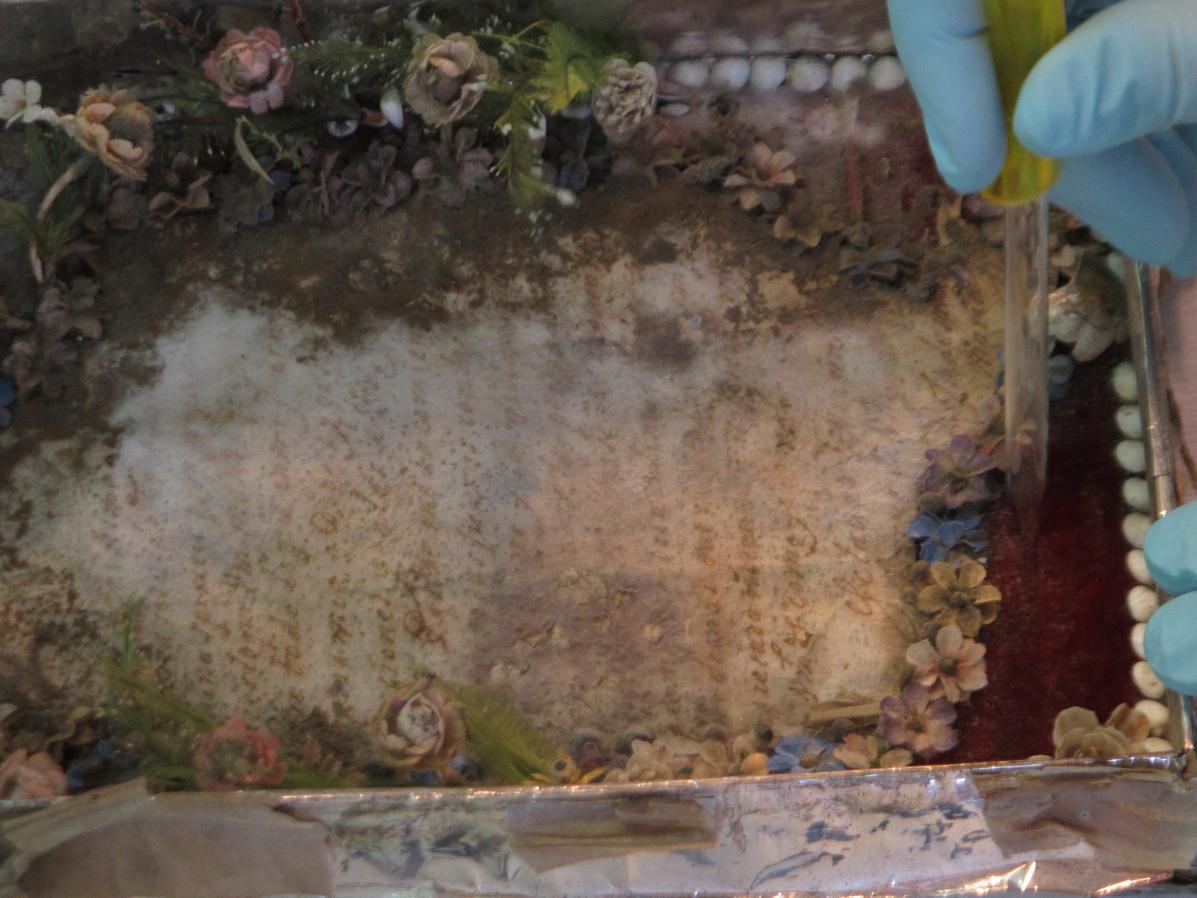 Se aspiró todo el documento y la decoración que formaba parte del montaje. Gracias a que la punta de la pipeta es muy fina fue posible alcanzar todos los intersticios lo que no habría sido posible si la limpieza se hacía con brocha. Se tuvo la precaución de no tocar el documento para evitar que la fuerza de la succión lo rompiera (Imagenes 3 a 5).