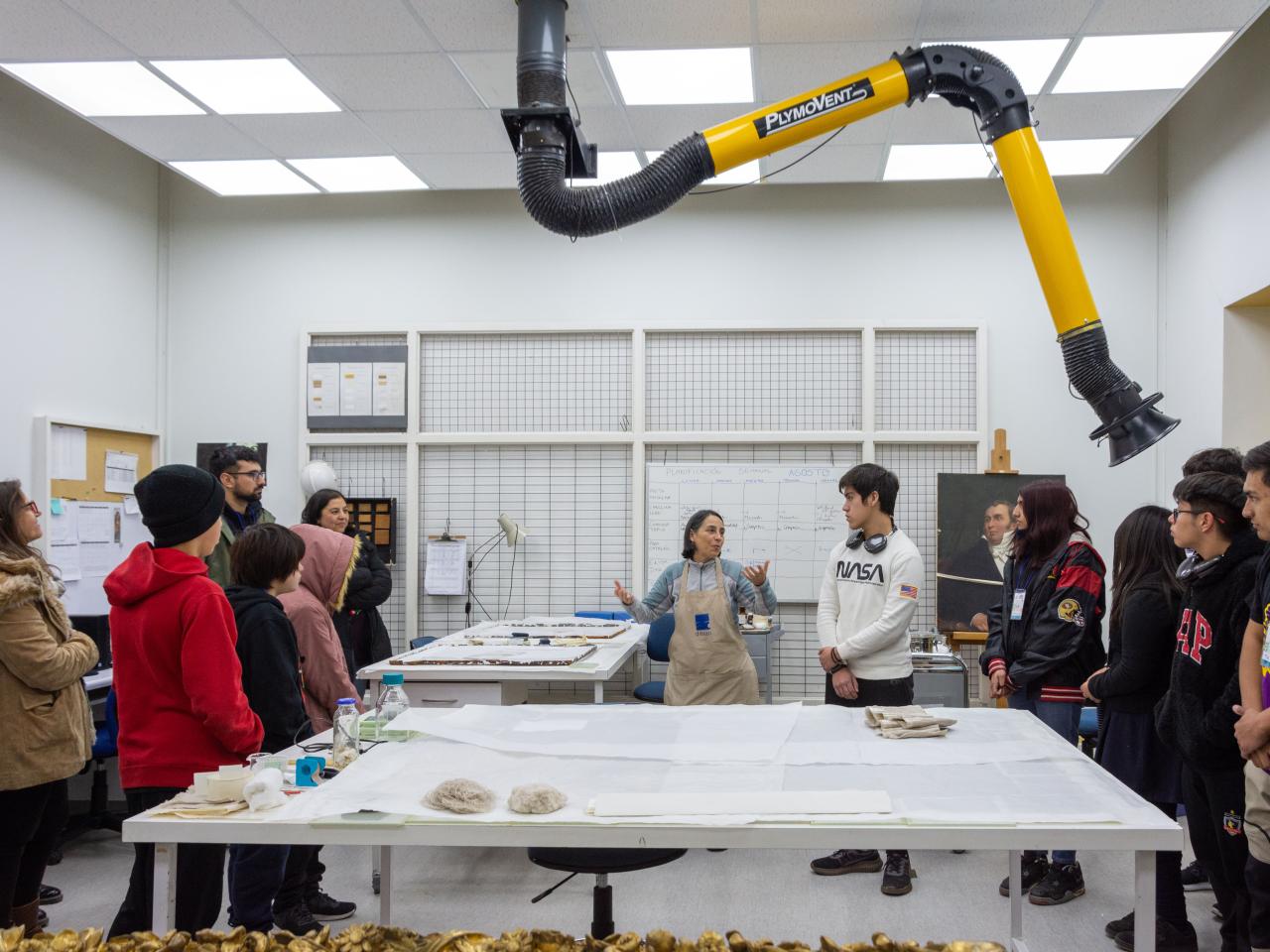 El taller brindó la oportunidad a los participantes de conocer de primera mano las herramientas y técnicas utilizadas en la conservación y restauración de obras de arte, mediante el recorrido a las unidades de: Patrimonio de las Artes Visuales, Documentación Visual e Imagenología y Ciencias de la Conservación, donde el equipo les mostró las herramientas utilizadas en los análisis científicos, allí los estudiantes pudieron explorar una obra pictórica utilizando el microscopio digital, de esta forma se pudo transmitir la relevancia de los estudios científicos para la conservación del legado de Violeta, se pudieron identificar los pigmentos, soportes y técnicas empleados por la artista en sus obras. Estos hallazgos no solo permiten una mejor comprensión de su proceso creativo, sino que también contribuyen a la preservación de su legado artístico. Esta experiencia además permitirá a los estudiantes aplicar los conocimientos adquiridos en sus propios proyectos de investigación.
