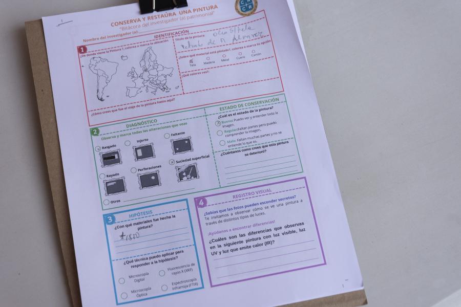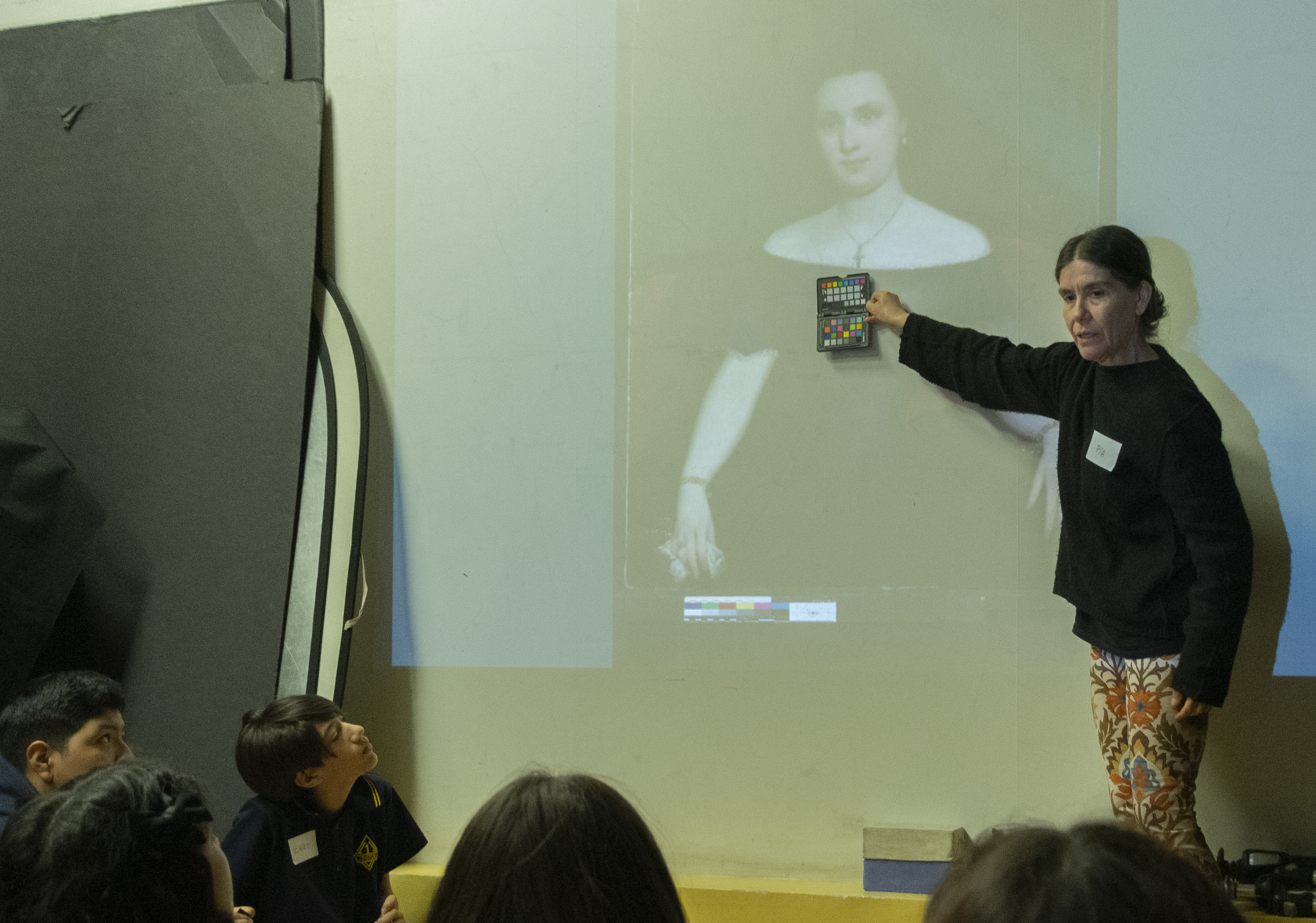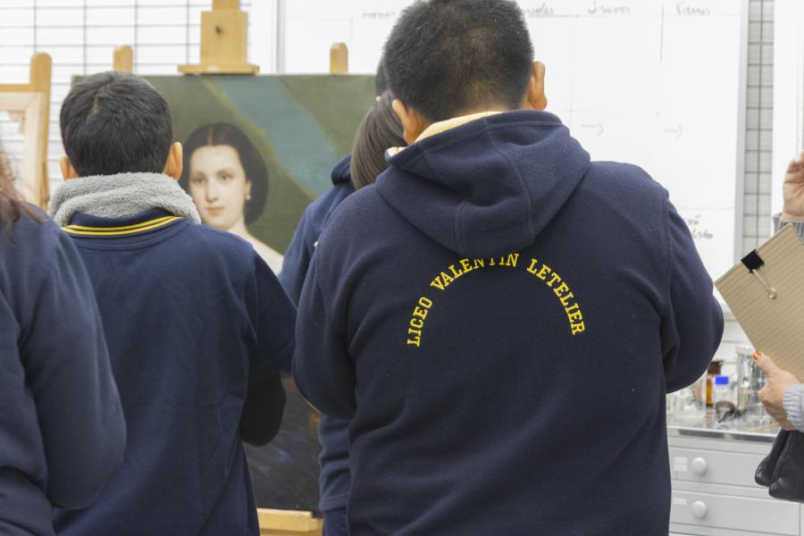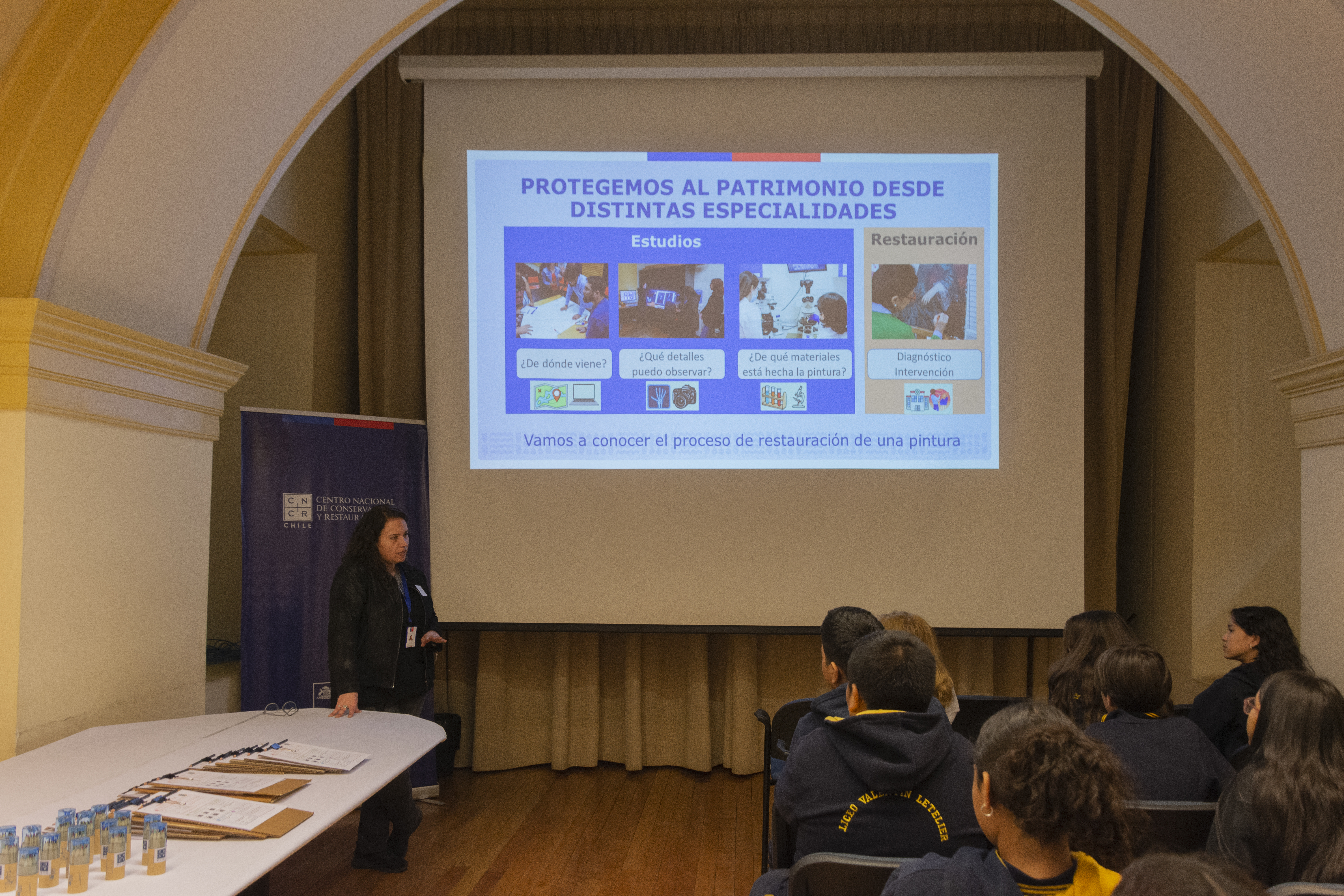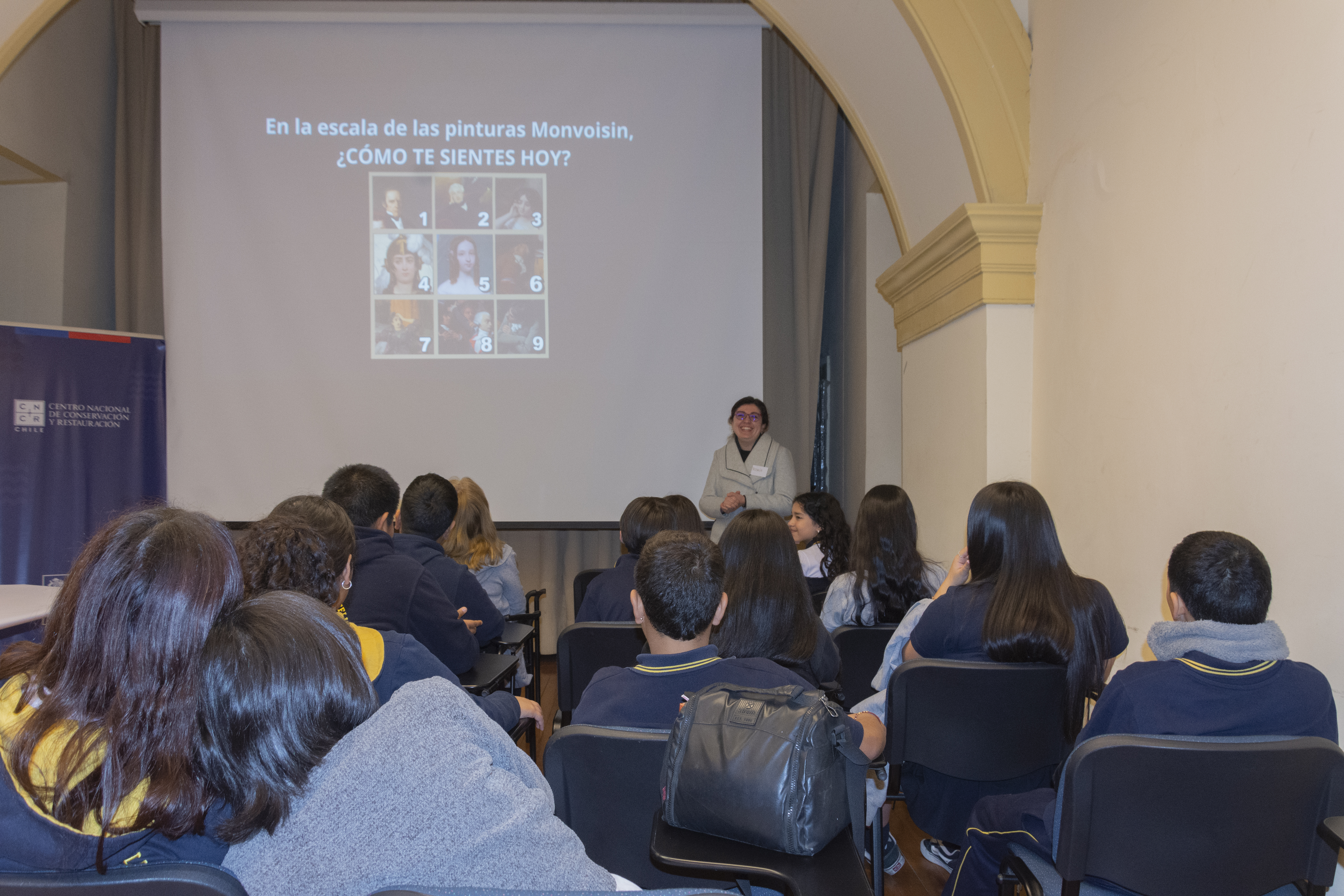 El pasado jueves 23 de octubre, el Centro Nacional de Conservación y Restauración (CNCR) abrió sus puertas para recibir a un entusiasta grupo de estudiantes de 6.°, 7. ° y 8. ° básico del Liceo Valentín Letelier, de la comuna de Recoleta. Estos jóvenes, integrantes del Taller de Patrimonio Cultural Natural, participaron de una jornada educativa inmersiva con el taller “Mochila y pincel: siguiendo los pasos de Raymond Monvoisin”. La actividad, organizada por el CNCR con el apoyo de la Unidad de Participación Ciudadana del Servicio Nacional del Patrimonio Cultural (Serpat), ofreció una experiencia educativa integral que combinó dinámicas interactivas, recorridos por unidades técnicas y una práctica de restauración simbólica de obras de arte. Durante la jornada, el grupo de estudiantes fue invitado a sumergirse en el proceso de conservación de la pintura Retrato de Mercedes Alvarez, del artista Raymond Monvoisin, mediante una metodología activa que promovió el aprendizaje a través de la interacción directa con especialistas del CNCR. La actividad se desarrolló en diversas etapas. Comenzó con la bienvenida por parte de Bernardita Ladrón de Guevara, directora del CNCR, seguida de la presentación del cuento “El pincel de los recuerdos”, que introdujo de manera lúdica el rol del CNCR en la conservación del patrimonio. Posteriormente, se exhibió material audiovisual elaborado por la Unidad de Patrimonio y Territorio (UPT), que contextualizó la figura de Monvoisin y sus viajes en el territorio. Posteriormente el grupo inició su recorrido por las distintas unidades, en el que conocieron el proceso de restauración de una pintura. En la Unidad de Patrimonio de las Artes Visuales (UPAV) pudieron ver la el retrato original, además de conocer antecedentes sobre su procedencia, historia y manufactura. En tanto, la Unidad de Documentación Visual e Imagenología (UDVI) conocieron los distintos estudios por imágenes que se realizan a las obras que ingresan a intervención, como fluorescencia por radiación ultravioleta, reflectografía y transmitografía IR. En la Unidad de Ciencias de la Conservación (UCC) conocieron las técnicas científicas que se utilizan para obtener información acerca de los materiales que componen la obra y cómo fueron aplicados, como la microscopía y espectroscopía infrarroja por transformada de Fourier, para ver los estratos de una pintura, o la identificación del barniz aplicado. Antes de comenzar el recorrido se les entregó una ficha de conservación, que fueron completando a medida que visitaban las unidades. Como actividad de cierre, se les propuso el ejercicio de restaurar una pintura, lo que permitió reflexionar acerca de los deterioros, los materiales y el valor de conservar la memoria visual de nuestro pasado. Esta actividad buscó promover el aprendizaje desde la experiencia, sembrando en las nuevas generaciones el interés por proteger y valorar el patrimonio cultural, integrando arte, ciencia y memoria en una jornada memorable.